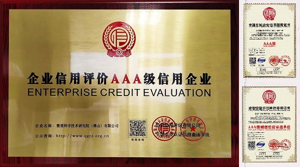 2020年9月,经第三方权威征信机构的审核,数效科学技术研究院(佛山)有限公司获得“AAA级企业信用等级”证书。诚信是企业立足市场的基石,是企业生存和发展的永恒动力,是一个企业和品牌的巨大无形资产和长盛不衰的精神资源。“AAA企业信用等级证书”代表了企业信用评定的最高级别,这是对数效科学技术研究院(佛山)有限公司实力和信誉的高度认可,是公司在健康发展过程中获得的又一重要里程碑,这一资质对企业后续发展具有深远的意义。