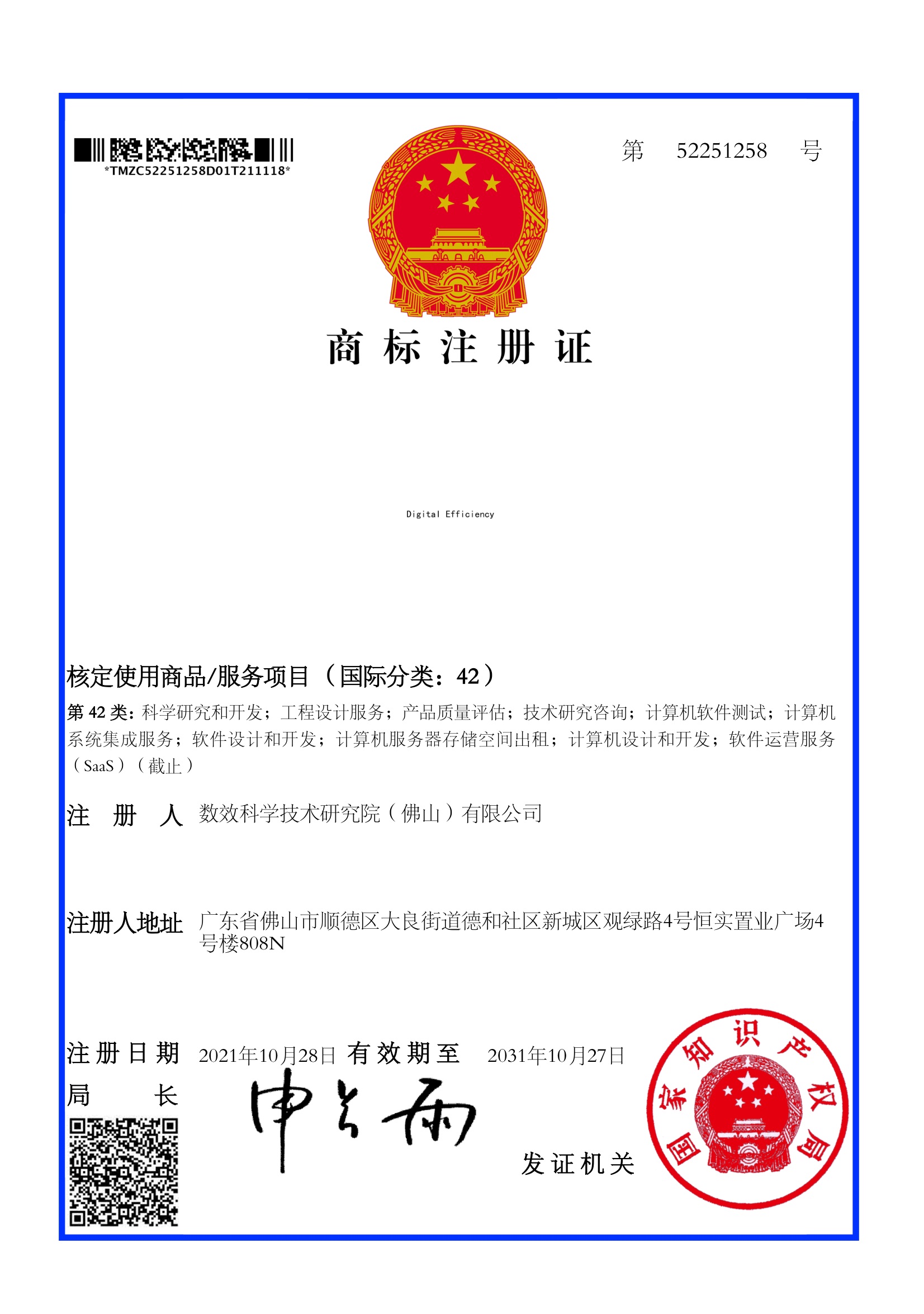 我单位“DIGITAL EFFICIENCY”商标的成功注册,不仅使该标志能够得到国家强制力的保护,而且对丰富单位品牌,维护单位名称,扩大单位影响,都将具有积极的意义;此证的颁发,是塑造单位品牌形象的有力举措,标志着数效科学技术研究院(佛山)有限公司在品牌建设方面奠定了坚实基础,为单位未来的发展添加了重要的一笔,真正建立起了走向市场的“名片”,是我单位的重要里程碑。